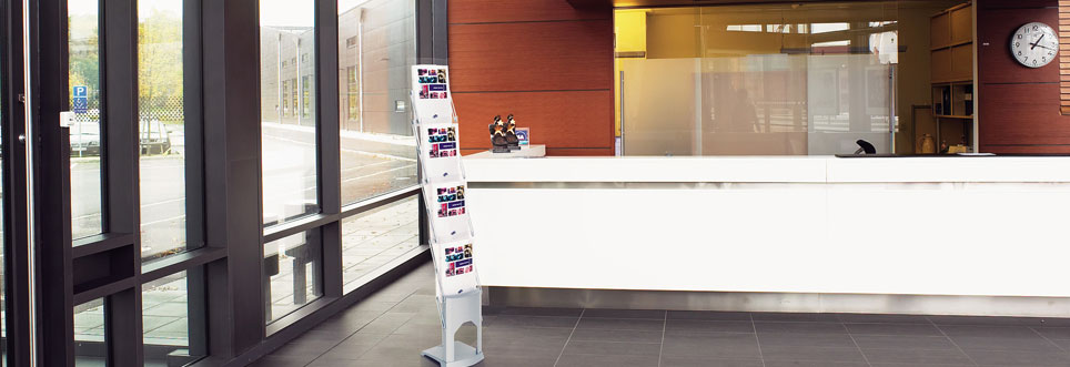 Aufgestellt bietet der Brochure Stand auf kleinster Stellfläche viel Platz für Broschüren, Kataloge, etc. Dank der vier hintereinander angeordneten Prospektschalen sind die Werbeunterlagen bis zum Format DIN A4 bequem von vorne zu entnehmen.